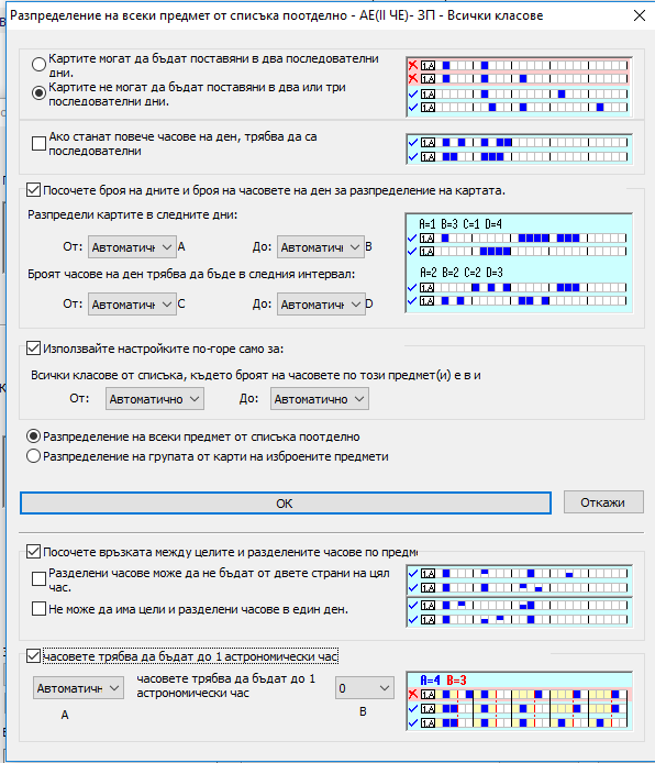 - С "Използвай горепосочените настройки само за..." вие можете да филтрирате класове, в които се прилага това разпределение. Така вие можете, например, да създавате разпределения за класовете, които имат 4 часа Математика на седмица без да е необходимо да избирате тези класове в предишната диалогова кутия.