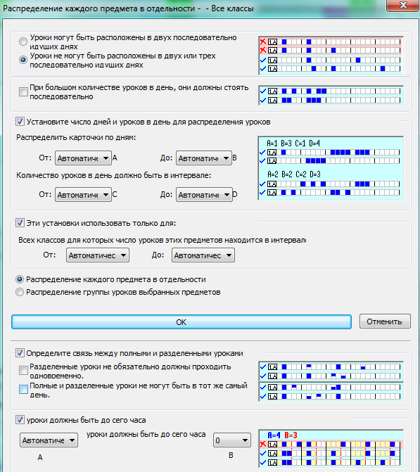 - "Распределение группы уроков выбранных предметов" может использоваться, чтобы распределить, например, "Биологию" и "Лабораторные по биологий" так, чтобы программа считала их тем же предметом и не ставила, например, в один день.