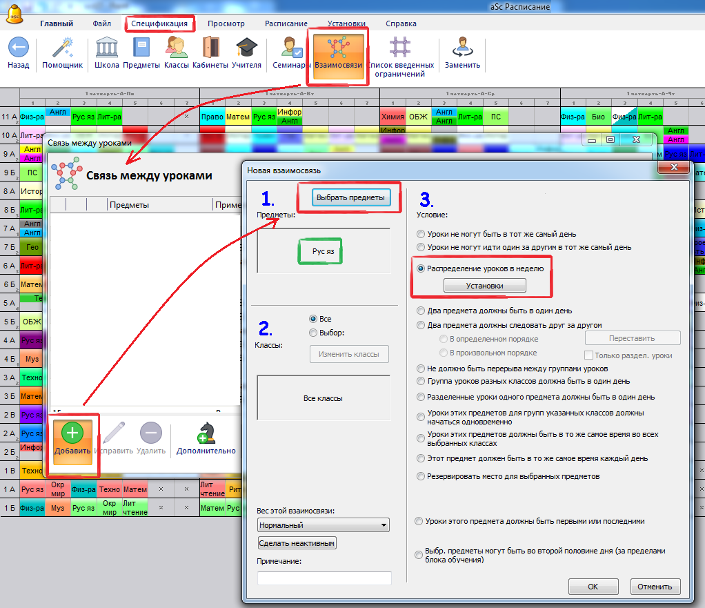 Если Вам не подходят вышеупомянутые условия по умолчанию, можете также создать собственные взаимосвязи распределения для некоторых предметов, выбрав команды "Взаимосвязи, Добавить" из меню "Спецификация", и "Распределение уроков в неделю, Установки":
