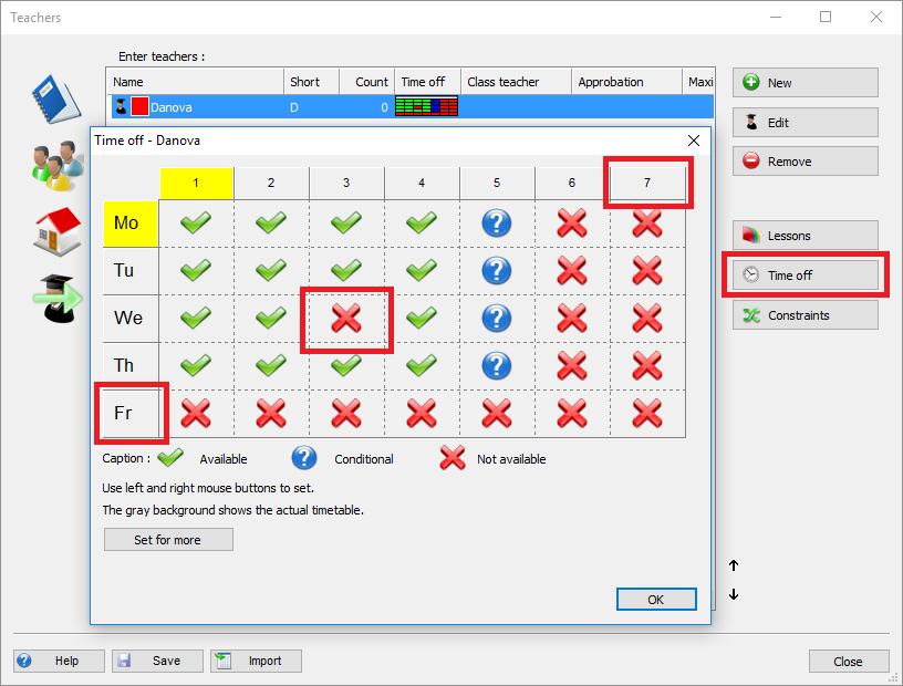 For classes, teachers, classrooms and subjects you can define so called "Time-off". It defines when lessons can be (green), and when they cannot be (red). You can also define so called "question marked positions", where lessons can be, but you wish to avoid having lessons there: