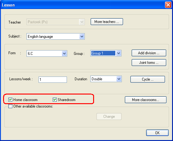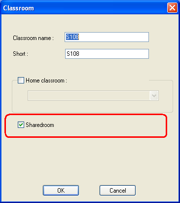 فيما بعد عندما تقوم بإدخال الدروس تستطيع تحديد أن هذا الدرس سوف يستقر في أحدى الغرف الدراسية المعلمة كا غرفة دراسية مشتركة. إذا لا تحتاج لتحديد كل هذه الغرف ,إذا بالاحرى تحديد كافة الغرف الدارسية الممكنة بالضغط مرة واحدة فقط.