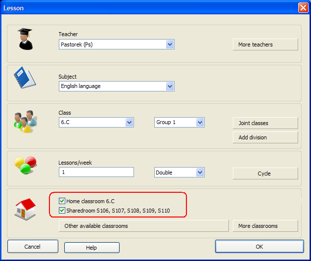 Después cuando esté introduciendo lecciones, podrá especificar que esta lección estará localizada en una de las aulas marcadas como compartida. Así usted no necesitará especificar todas las aulas, mejor con un clic especificar todas las aulas posibles.