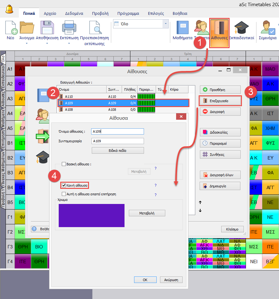 Όταν εισάγετε αίθουσες μπορείτε να προσδιορίσετε εάν θα είναι κοινές αίθουσες ή βασικές αίθουσες για κάποια τμήματα.