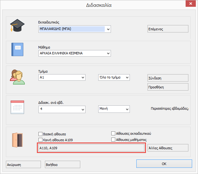 Για ορισμένα μαθήματα δεν θα χρησιμοποιήσετε βασικές ή κοινές αίθουσες αλλά θα ορίσετε συγκεκριμένες αίθουσες.