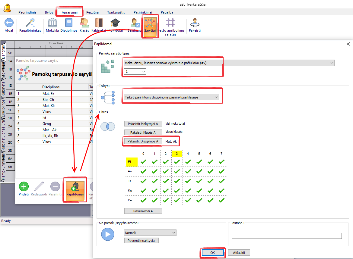 - pasirinkite sąlygą "Maks. pamokų skaičius per tą patį savaitės periodą".