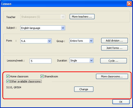 You can select one or more check boxes, e.g. both Home classroom and Shared room. In this case the software will assign either home classroom or one of the classrooms marked as shared.