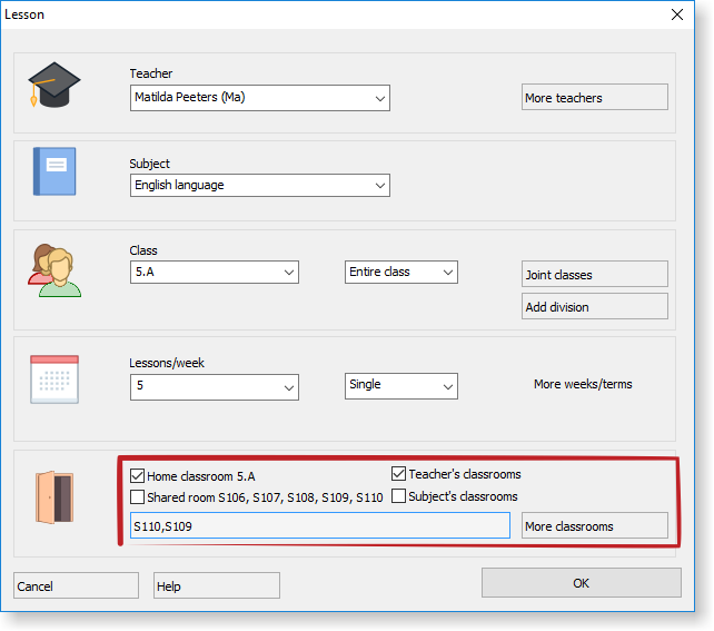 Puede especificar las aulas disponibles para la lección en el diálogo de la Editación de la lección. La parte inferior de este diálogo especifica aulas: