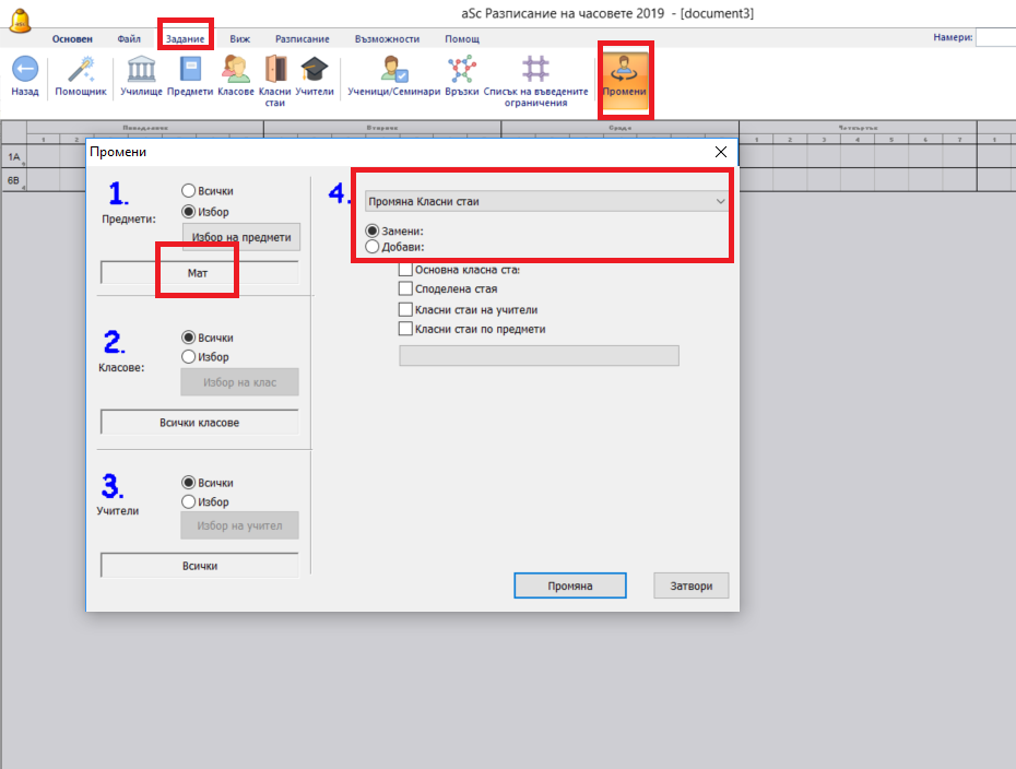 Можете да промените свободните класни стаи за много или всички часове едновременно като използвате менюто Задание/ Промени.