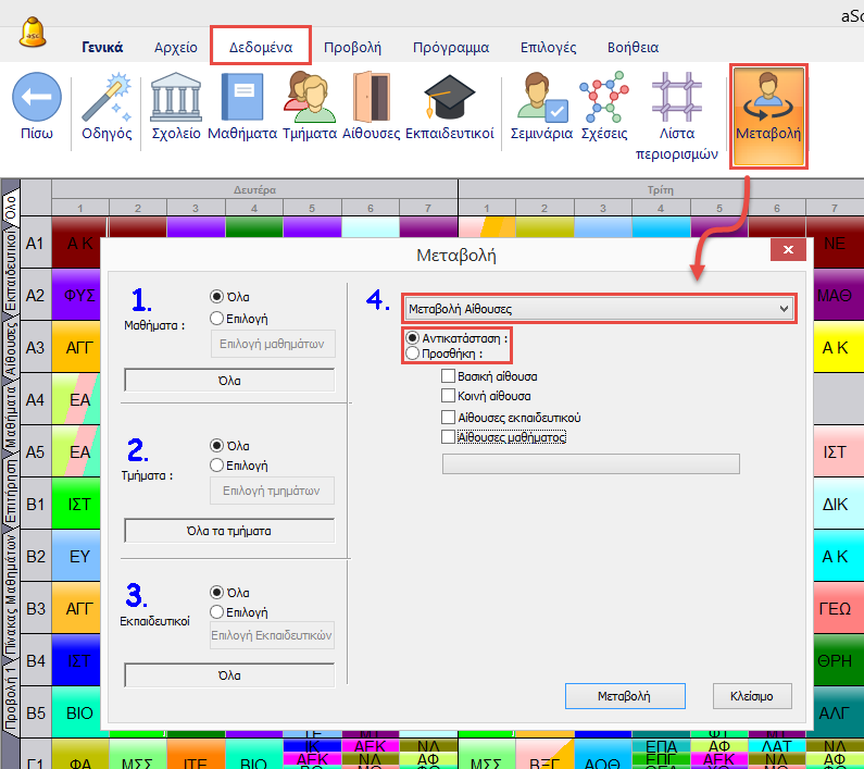 Μπορείτε να αλλάξετε τις διαθέσιμες αίθουσες για πολλαπλές ή όλες τις διδασκαλίες μαζικά χρησιμοποιώντας την λειτουργία στο μενού Δεδομένα/Μεταβολή.