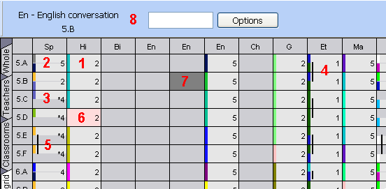 1) Ако една клетка е светлосива, това означава, че учебният предмет в колоната се преподава в съответния клас. Броят в клетката показва броя на учебните часове на седмица Цветната лента от лявата страна показва цвета на учителя.