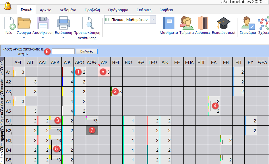 1) Εάν ένα κελί είναι έχει χρώμα ελαφρύ γκρι, σημαίνει ότι το μάθημα στο κελί διδάσκεται στο αντίστοιχο τμήμα. Ο αριθμός στο κελί δείχνει τον αριθμό το πλήθος των διδασκαλιών ανά εβδομάδα. Η χρωματιστή γραμμή στα αριστερά είναι το χρώμα του εκπαιδευτικού.
