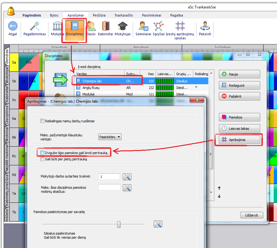 Jei norite, kad kai kurių disciplinų pamokos gali kirsti pertrauką (t.y. būtų viena valanda pamokos, pertrauka, po to antra valanda tos pamokos), tai galima nustatyti kiekvienai disciplinai atskirai, disciplinų apribojimų lange.