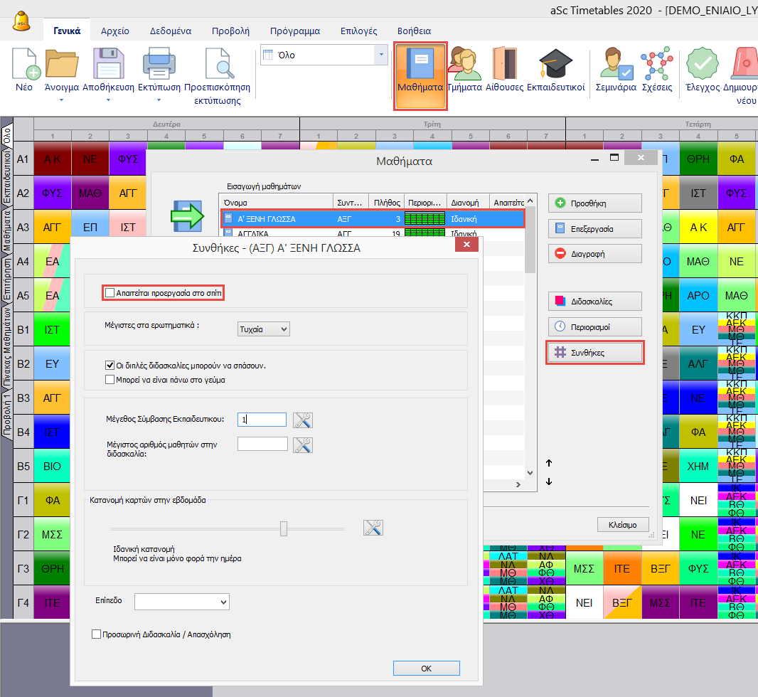 Εάν θέλετε να επιτρέψετε στις διπλές διδασκαλίες κάποιων μαθημάτων να υλοποιούνται παρόλο που κατά την διάρκεια τους υπάρχει διάλειμμα, μπορείτε να το ορίσετε ξεχωριστά για κάθε μάθημα.