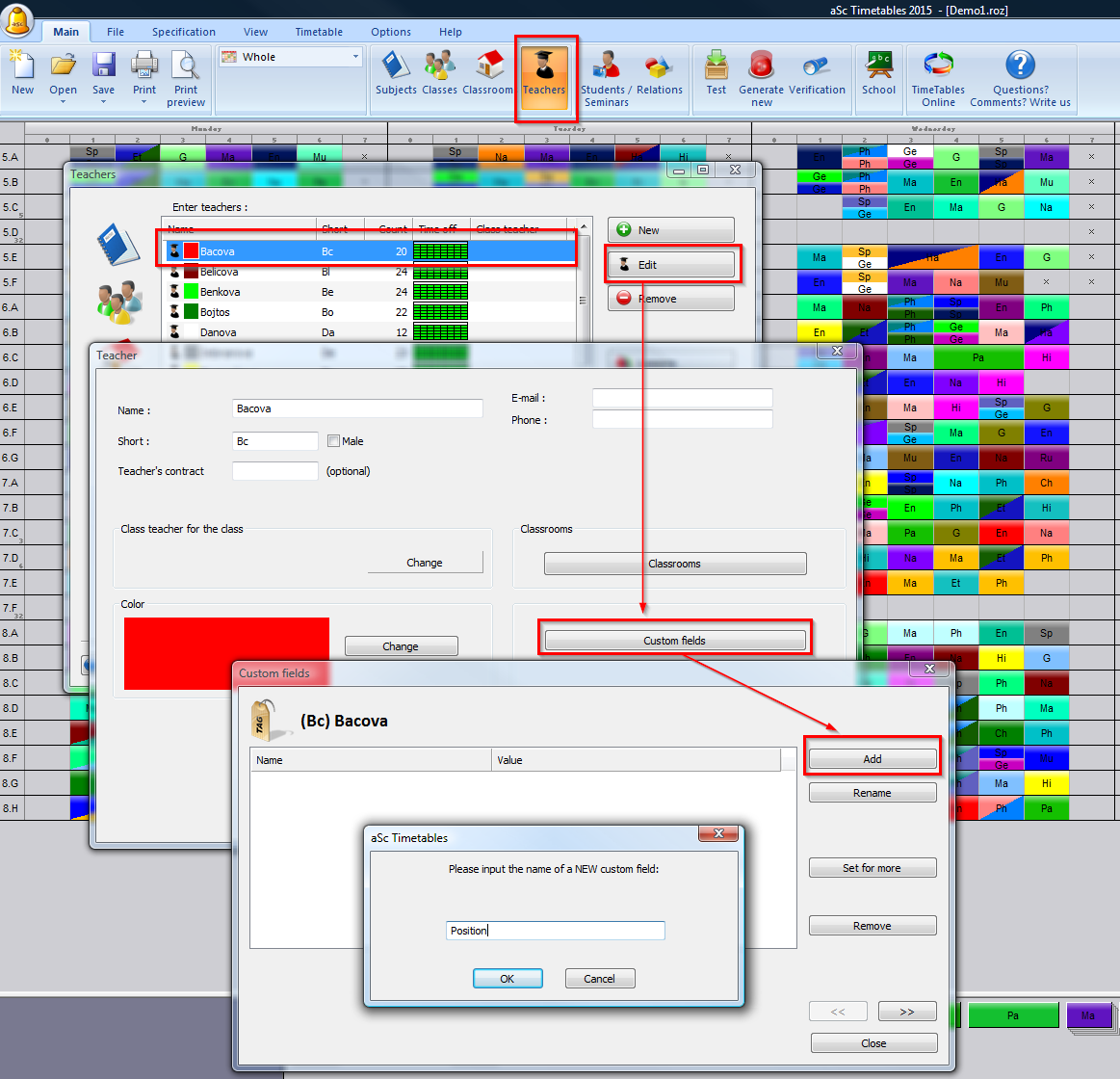 For example: if you need to input and print for each teacher his or her school position, you can go to teacher's custom fields: