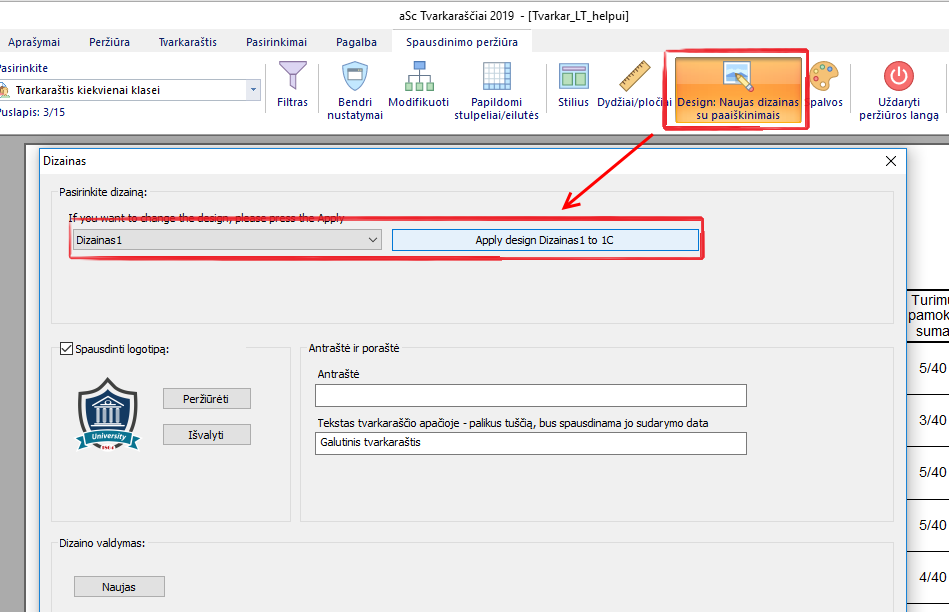 Paspauskite mygtuką Dizainas. Pasirinkite dizainą ir paspauskite mygtuką Pritaikyti. Programa paklaus, ar norite šį dizainą pritaikyti tik pasirinktai ar visoms klasėms.