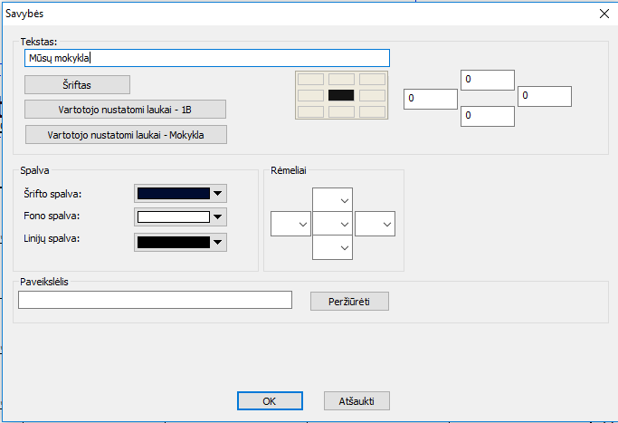 Atkreipiame dėmesį, kad tekste galima nurodyti dalis, kurios turi būti pakeistos pačios programos. Todėl, pavyzdžiui, vietoj klasės pavadinimo galite įrašyti tekstą kuriame yra toks tekstas {Klasė:Vardas} (reikia pasirinkti mygtuką "Vartotojo nustatomi laukai"), ir ši dalis bus pakeičiama klasės pavadinimu. Taip pakaks sukurti vieną dizainą, o spausdinant šis tekstas bus keičiamas tikru klasės pavadinimu, pavyzdžiui 8A, 8B, ir t.t.