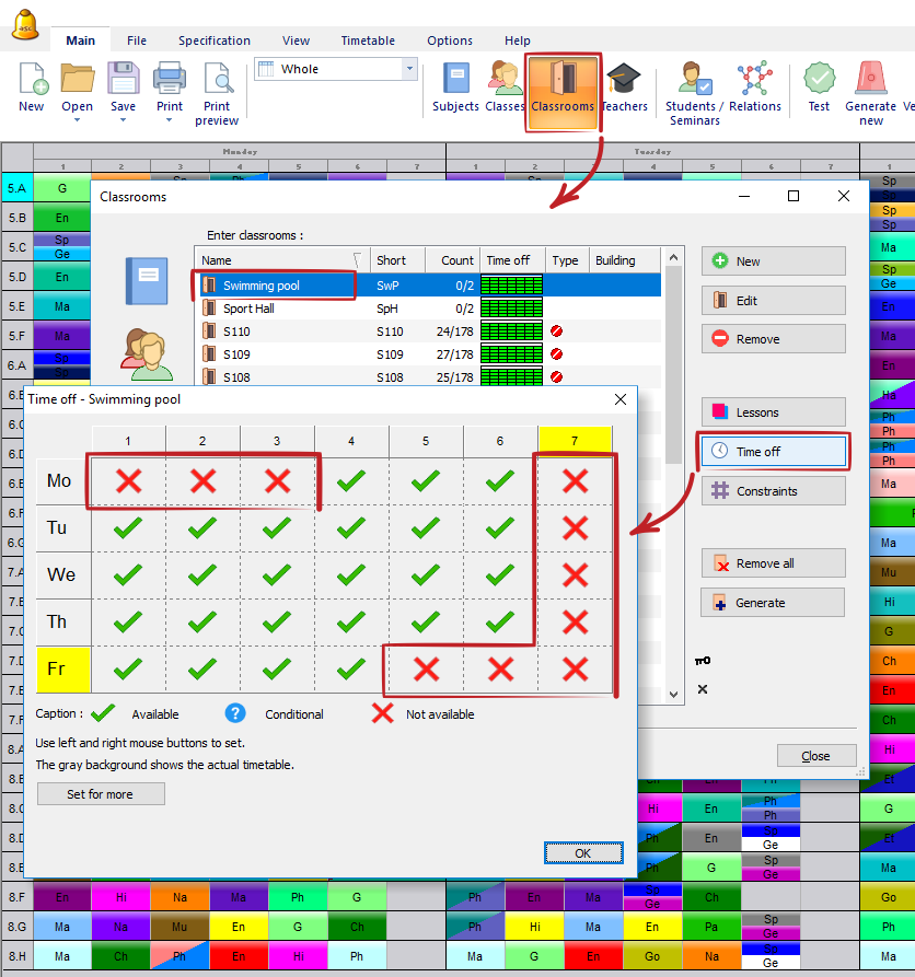 As with other objects (teachers, classes,...) you can use the "Time-off" to define when you can use certain classroom.