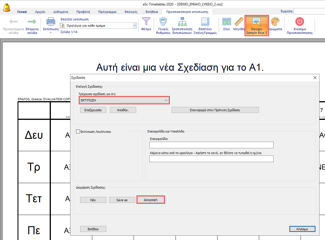 Ή μπορείτε να αφαιρέσετε την σχεδίαση από το ωρολόγιο, ώστε όλες οι εκτυπώσεις να έχουν την προκαθορισμένη μορφή. Κατευθυνθείτε στο μενού Γενικά/Προεπισκόπηση εκτυπώσεων/Design:Standard και να διαγράψετε την εκτύπωση.