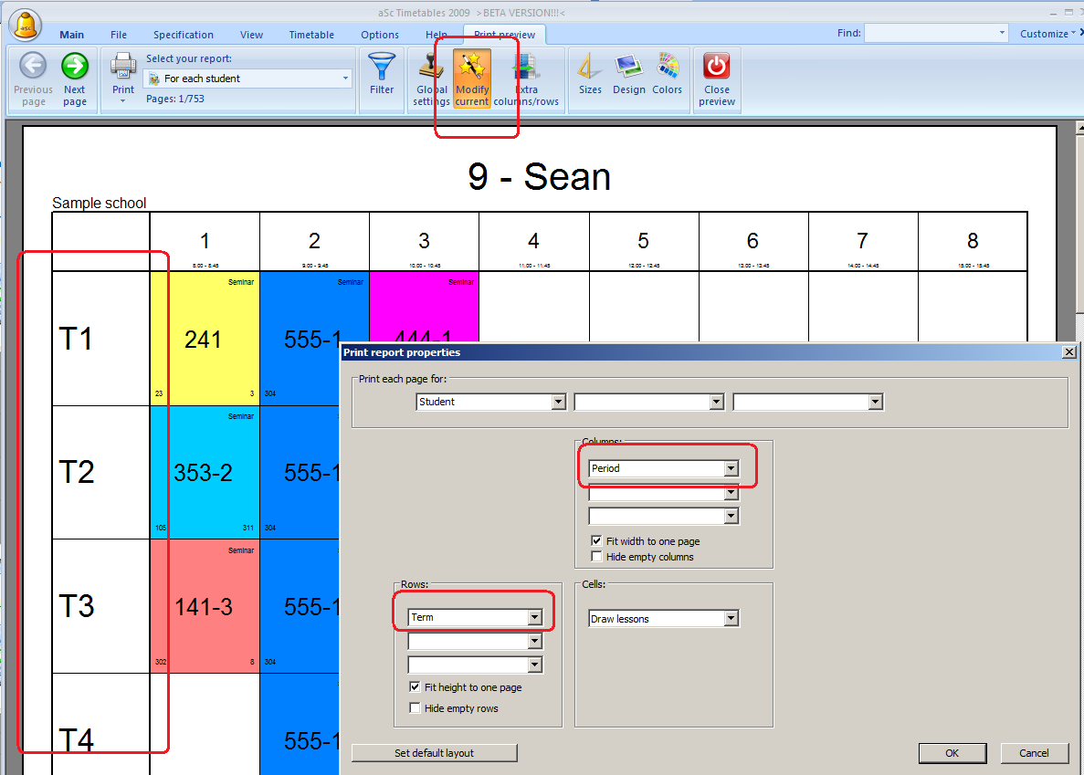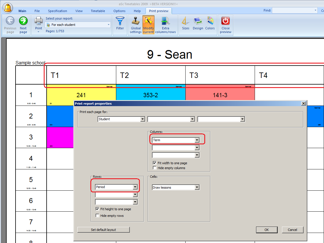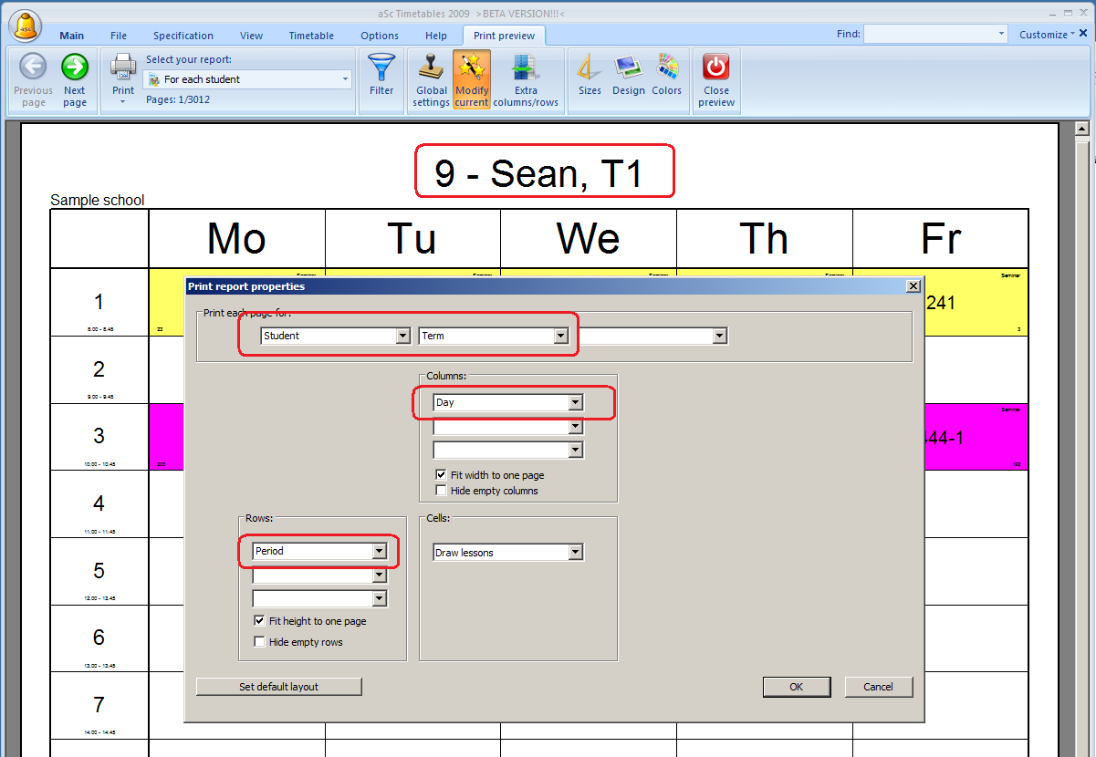Всеки път, когато избирате в основната кутия с комбинации, че искате да принтирате разписание за всеки ученик, ще се използва този нов променен изглед.