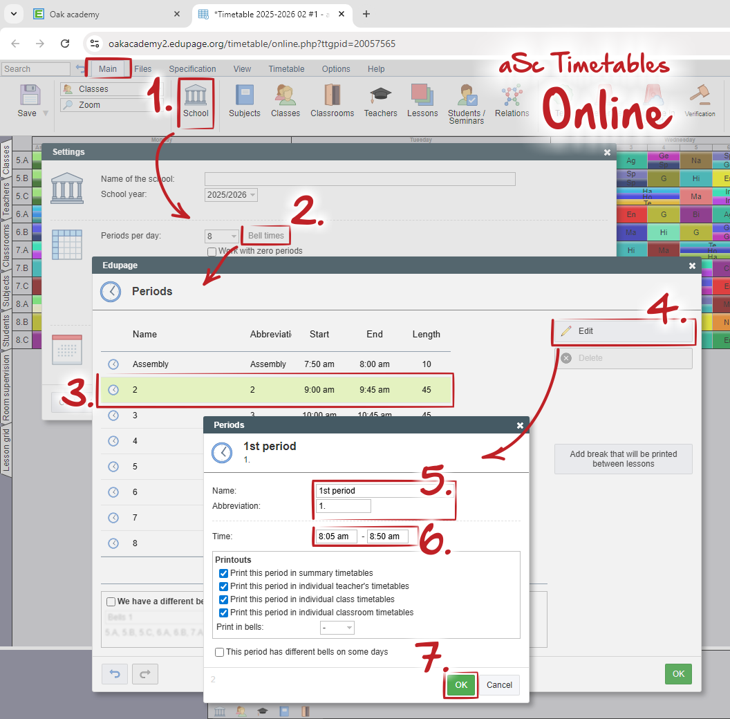 Ako premenovať názvy hodín a nastaviť začiatok a koniec zvonenia pre každú vyučovaciu hodinu?