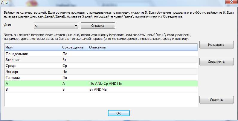 Если школа имеет 2 разные дня: День А и День B, и День А - это понедельник, среда и пятница, а День B - вторник и четверг. Тогда вы можете создать новые дни A и B. Просто используйте кнопку "Соединить":