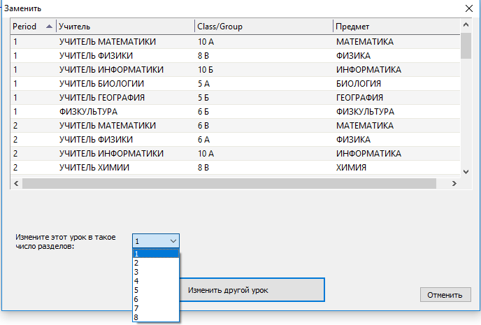 Теперь новые уроки появятся в списке замен, дважды щелкните на них, чтобы изменить учителя / кабинет / предмет.