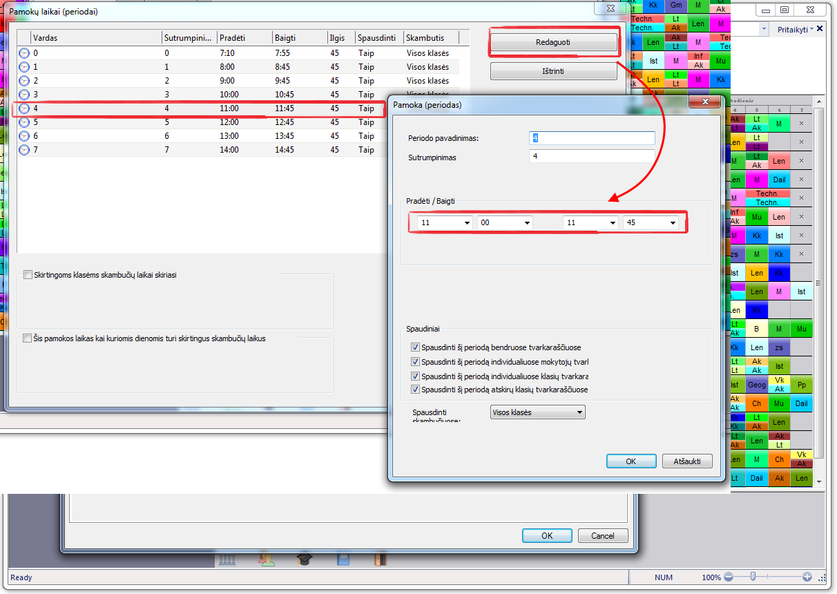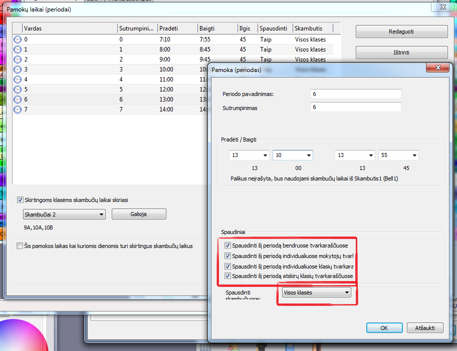 Pastaba: dažna klaida yra "Spausdinti skambučiuose" pakeisti į Skambutis 2". Reikia palikti "Visos klasės", nes kitaip šis skambučio laikotarpis bus atspausdinamas tik klasėms, kurioms galioja "Skambutis 2" pamokų laikai.