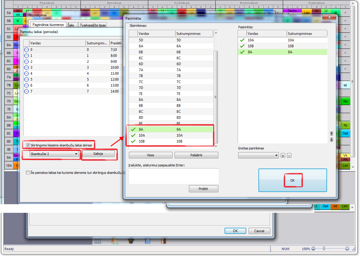 2. Tik nustačius "Skambučiai 1" laikus, pažymėkite "Skirtingoms klasėms skambučių laikai skiriasi" ir, paspaudus "Galiojimas", pasirinkite, kurioms klasėms jie galios.