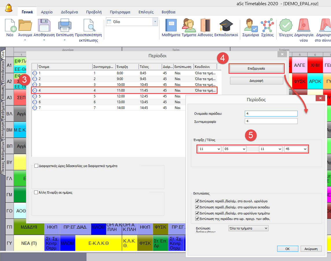 Σημείωση: Αυτές οι ώρες δεν θα επηρεάσουν την δημιουργία του ωρολογίου. Εάν έχετε περιόδους που συμπίπτουν θα πρέπει να εισάγετε περιορισμούς για τους εκπαιδευτικούς.