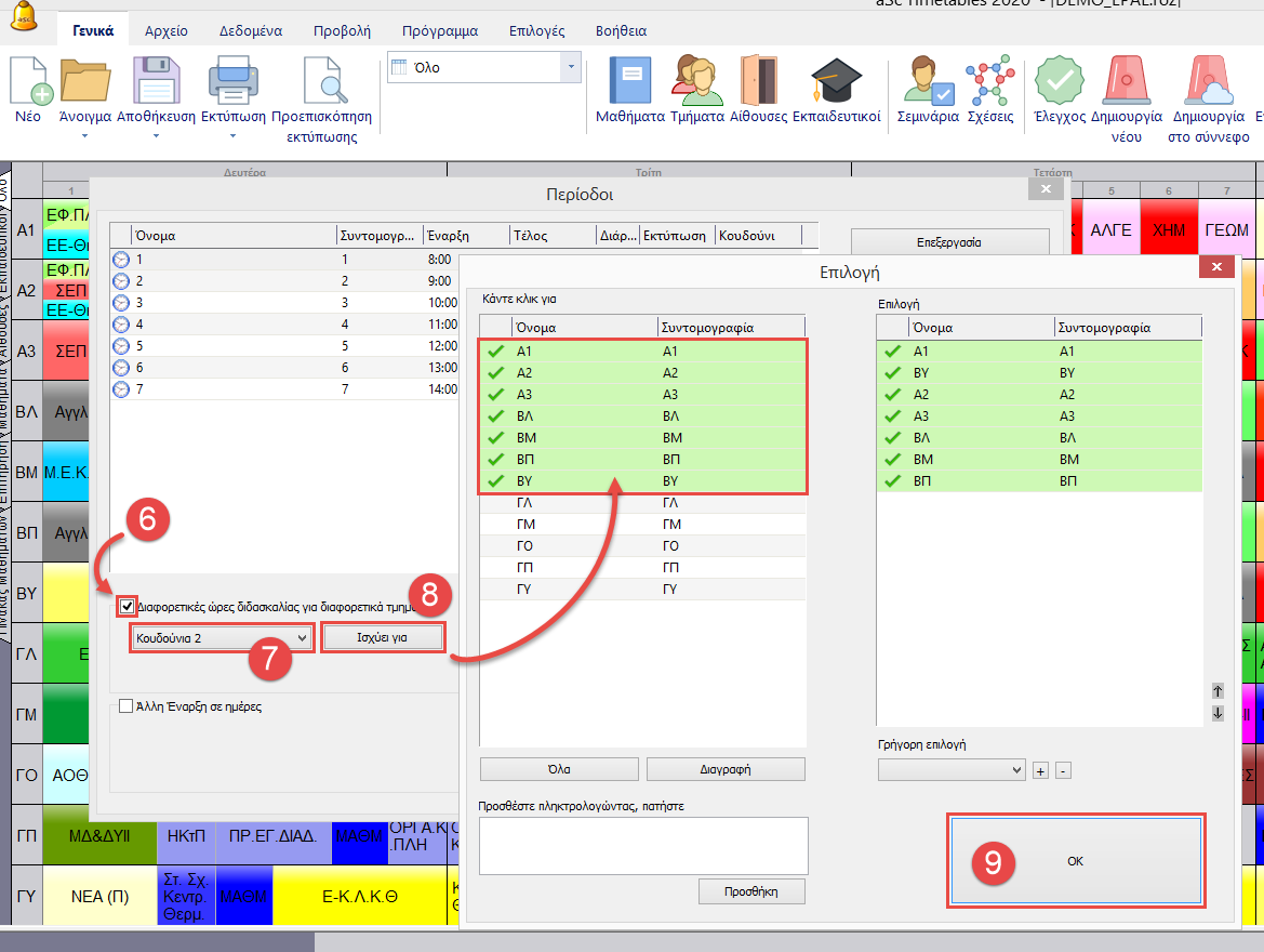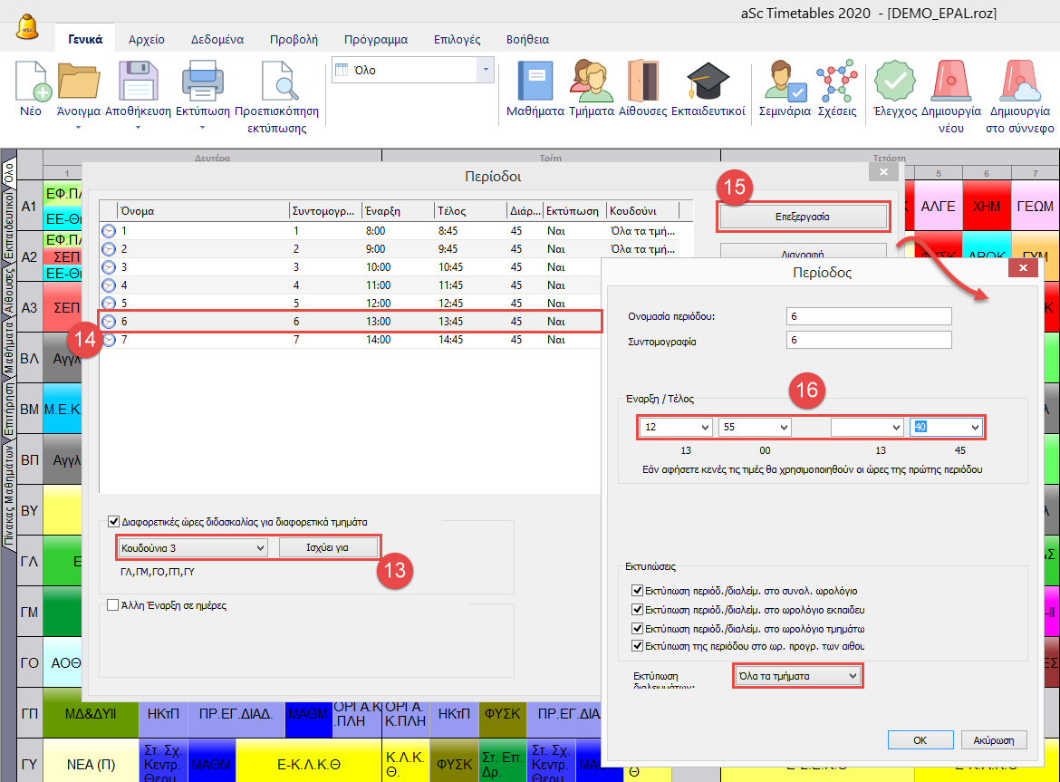 Σημείωση: Σύνηθες λάθος είναι να αλλάξετε την Εκτύπωση διαλειμμάτων σε κουδούνι 2Μην το αλλάξετε και αφήστε όλα τα τμήματα. Αλλιώς αυτή η περίοδος θα εκτυπωθεί σε όλα τα τμήματα που είναι στο Κουδούνι 2.