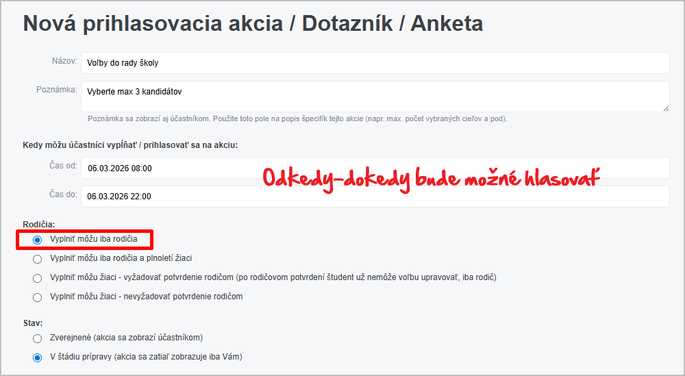 Ak robíte prihlasovaciu akciu pre rodičov zaškrtnite "Hlasovať môžu iba rodičia".