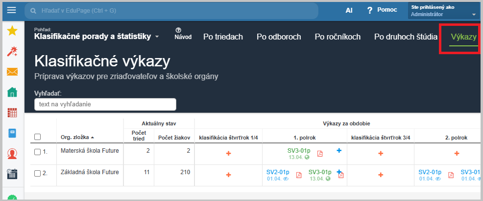 Štatistické výkazy nájdete v sekcii Pedagogická dokumentácia, Klasifikačné porady a štatistiky.