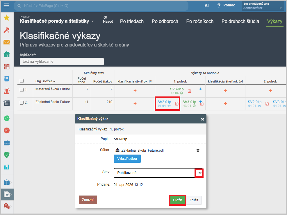 Publikované výkazy sa zobrazujú zelenou farbou a sú publikované zriaďovateľovi v ich aScOrbit. Nemusíte nič tlačiť.