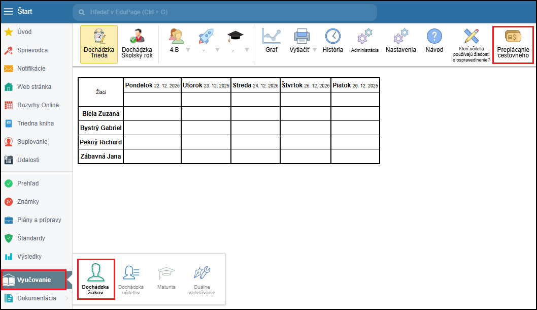 Preplácanie cestovného vám poskytuje náhľad koľko má byť každému žiakovi vyplatené za daný mesiac. Systém automaticky vypočíta sumu za každý mesiac na základe dochádzky žiaka a zadaných denných cestovných nákladov na dopravu žiaka. Nemusíte teda už nič prepočítavať a ušetríte si čas. V prípade, že nechcete aby sa pre určitý typ absencie cestovné počítalo (reprezentácia, exkurzia), tak pozrite tento návod. Ako zadať aby sa príspevok na dopravu žiakov pre určitý typ absencie nepočítal