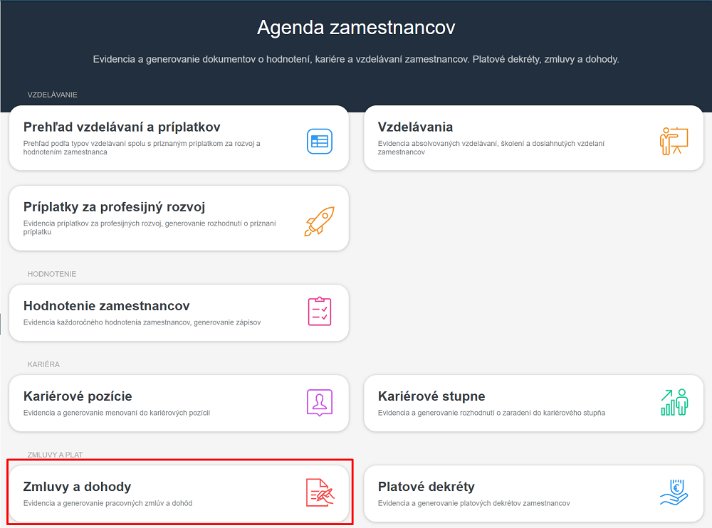 Pracovné zmluvy a dohody môžete vygenerovať cez Dokumentácia/Agenda zamestnancov.