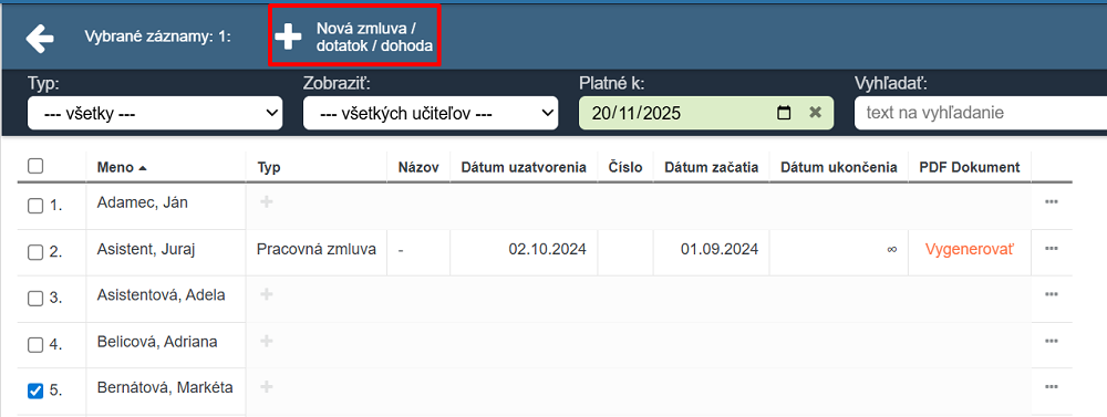 Zaškrtnite jedného alebo viacerých zamestnancov a zvoľte Nová zmluva/dodatok/dohoda.