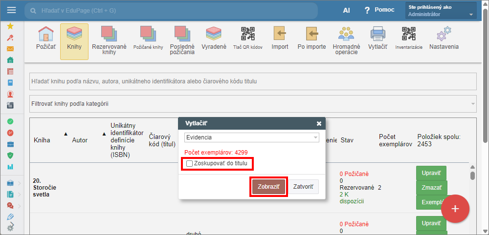 Výberom "Zoskupovať do titulu" budú všetky exempláre jedného titulu zobrazené v jednom riadku. Zobrazená cena bude súčet jednotlivých exemplárov. Kliknite "Zobraziť".