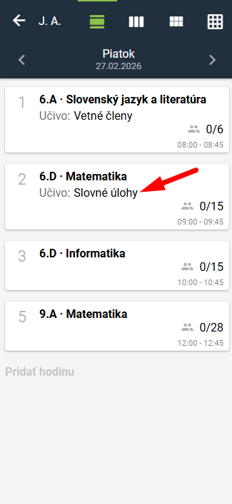 Učiteľ v triednej knihe vyberie učivo z plánu.