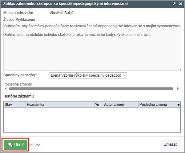 Zvoľte Súhlas zákonného zástupcu so špeciálnopedagogickými intervenciami.