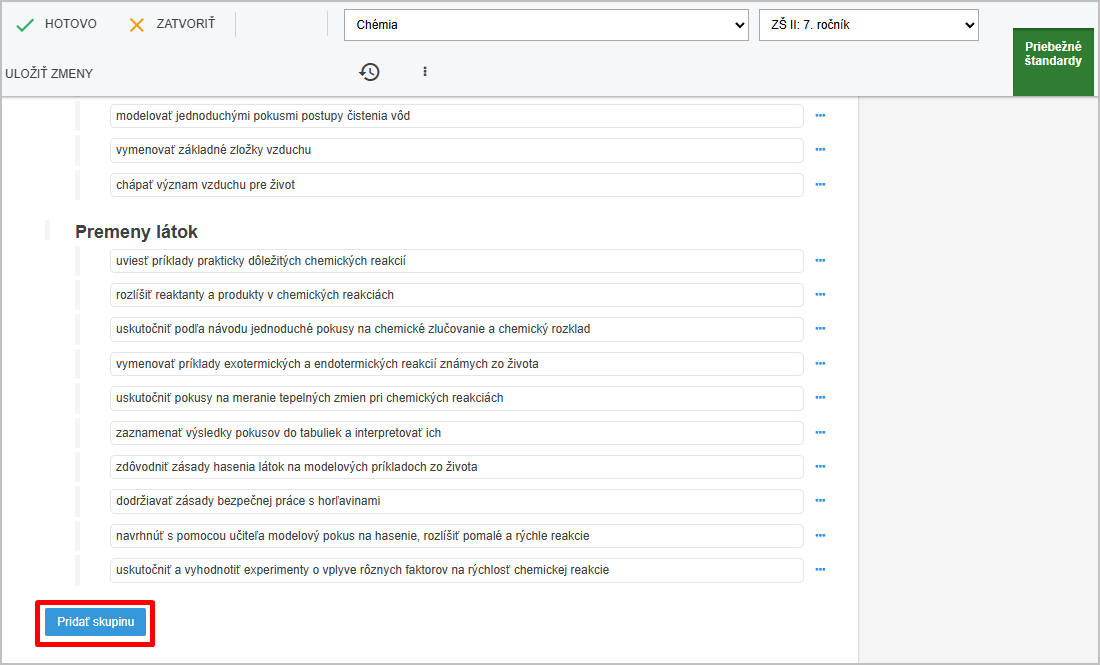 Novú skupinu štandardov pridáte tlačidlom Pridať skupinu.