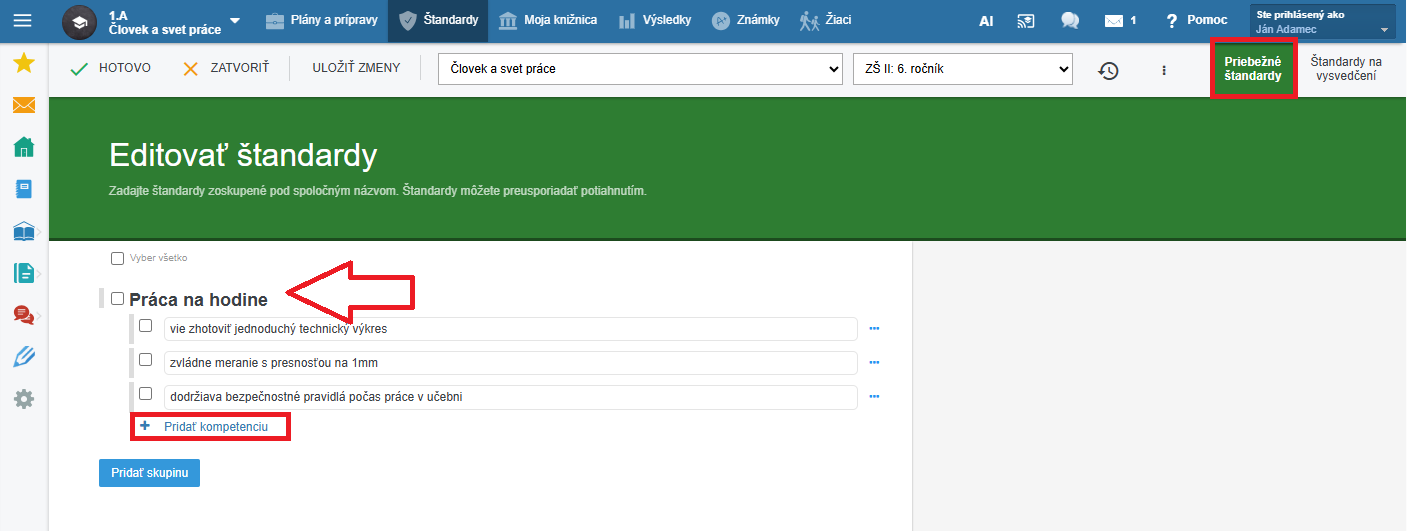 V položke "Priebežné štandardy" zadajte názov skupiny a jednotlivé štandardy. Nový štandard pridáte tlačidlom Pridať kompetenciu.