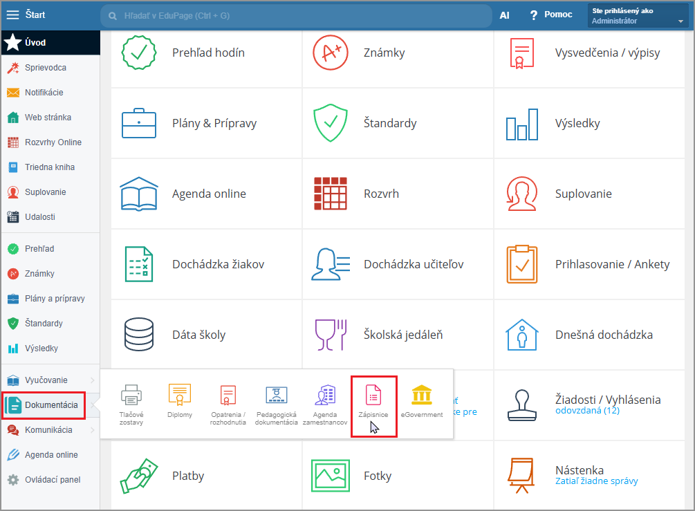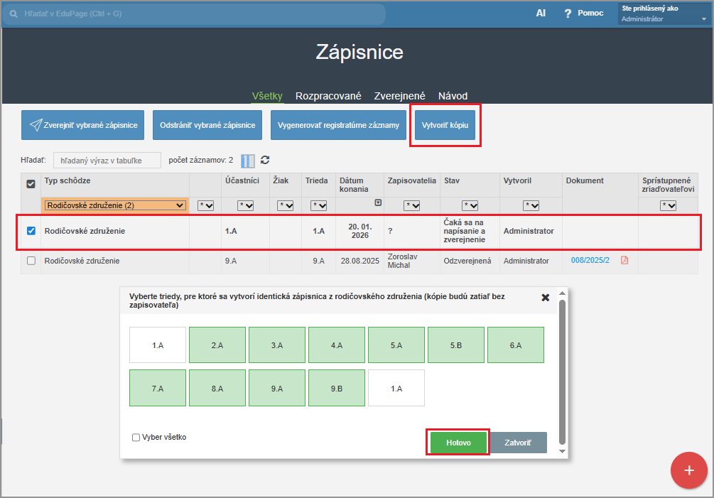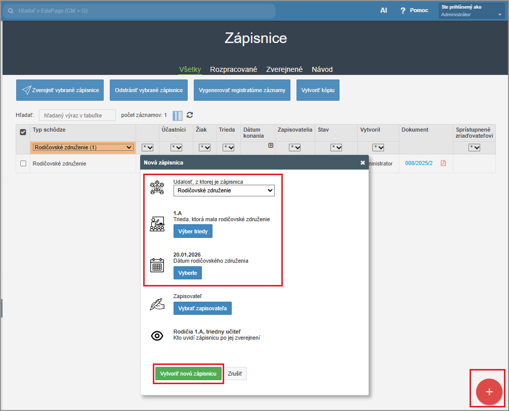 V module Zápisnice vytvorte jednu zápisnicu, pre jednu konkrétnu triedu.