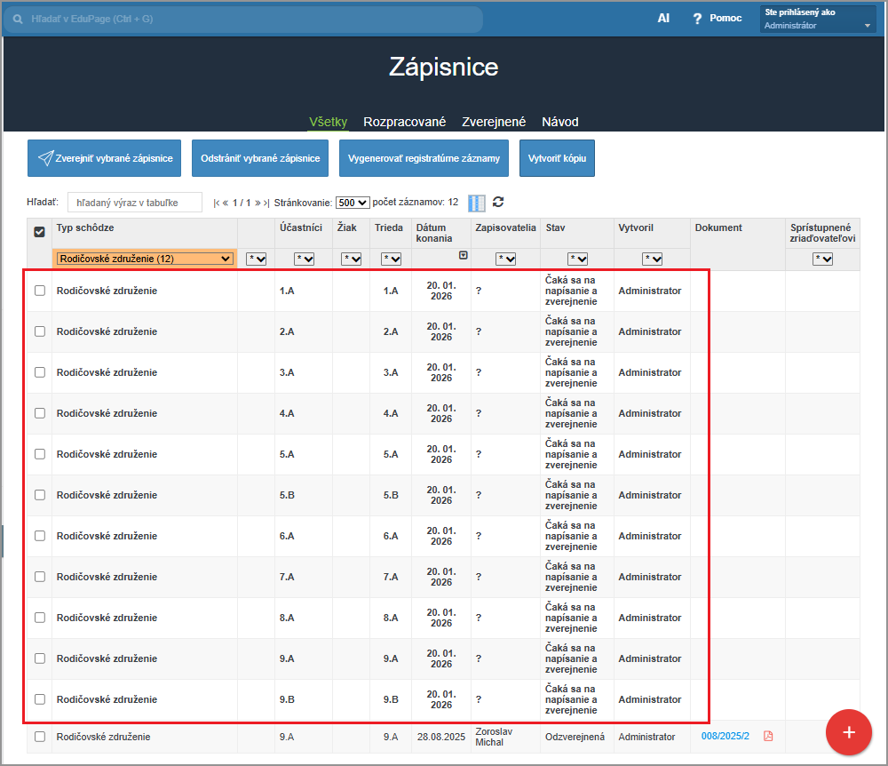 V takom prípade môže administrátor spísať spoločné body, ktoré budú predmetom stretnutia v každej z tried.