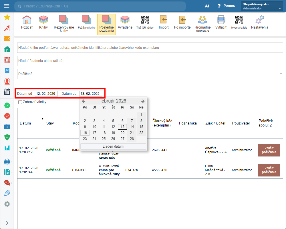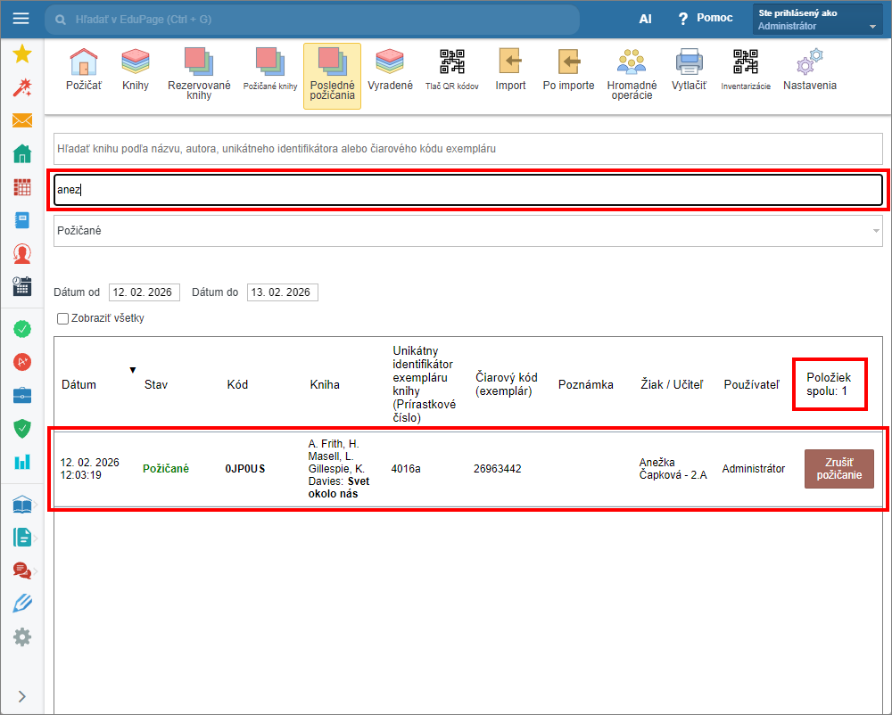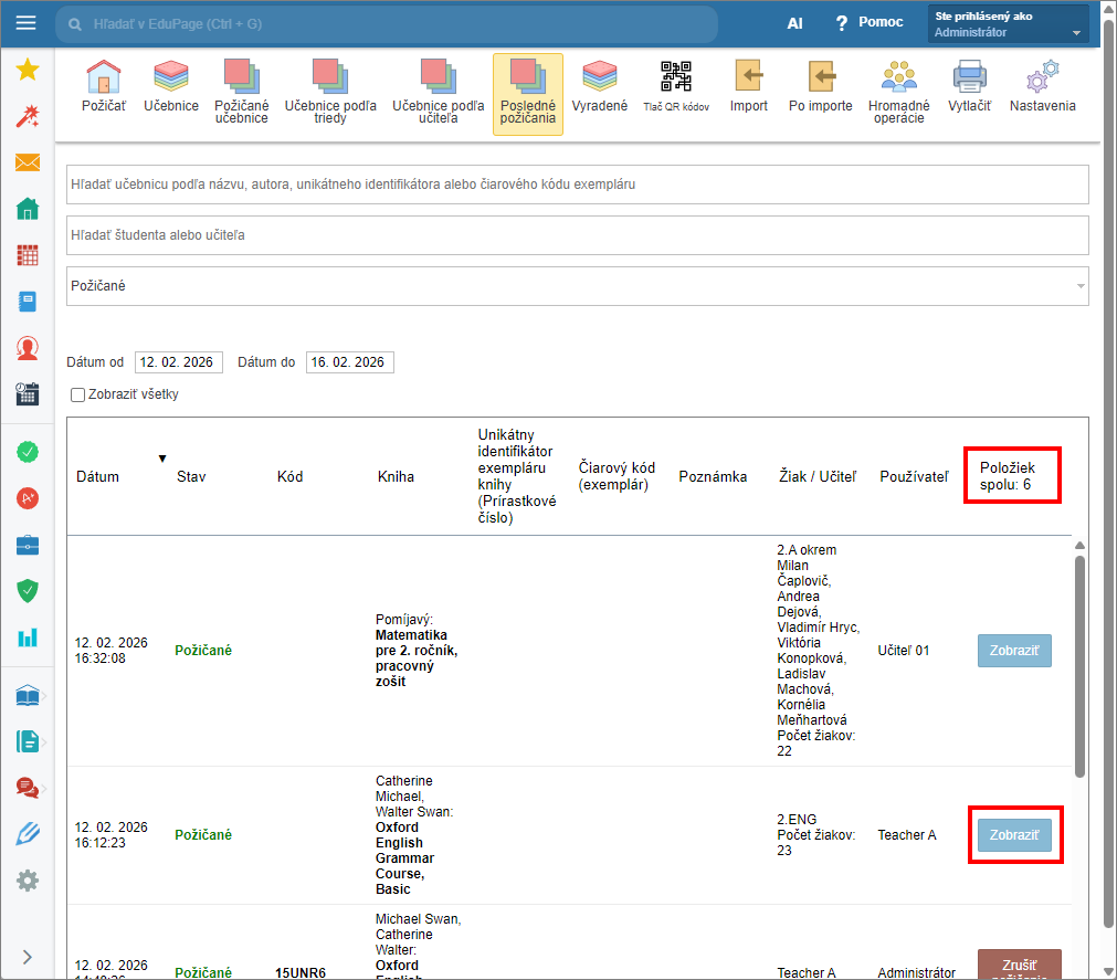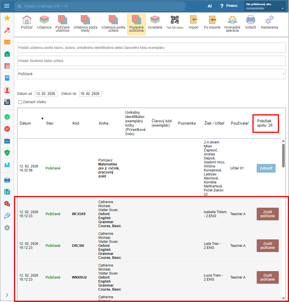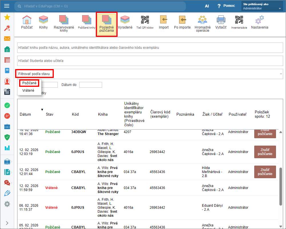 Ako zistím počet výpožičiek/vrátení v záložke “Posledné požičania” v Knižnici a Sklade učebníc.