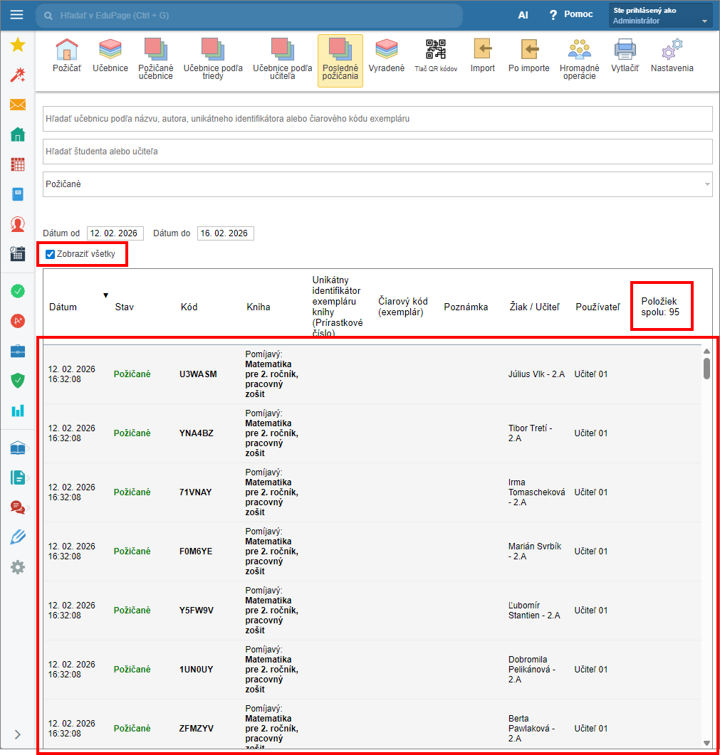 Kliknutím na políčko “Zobraziť všetky”, budú zobrazené a započítané výpožičky jednotlivých užívateľov všetkých hromadných výpožičiek.