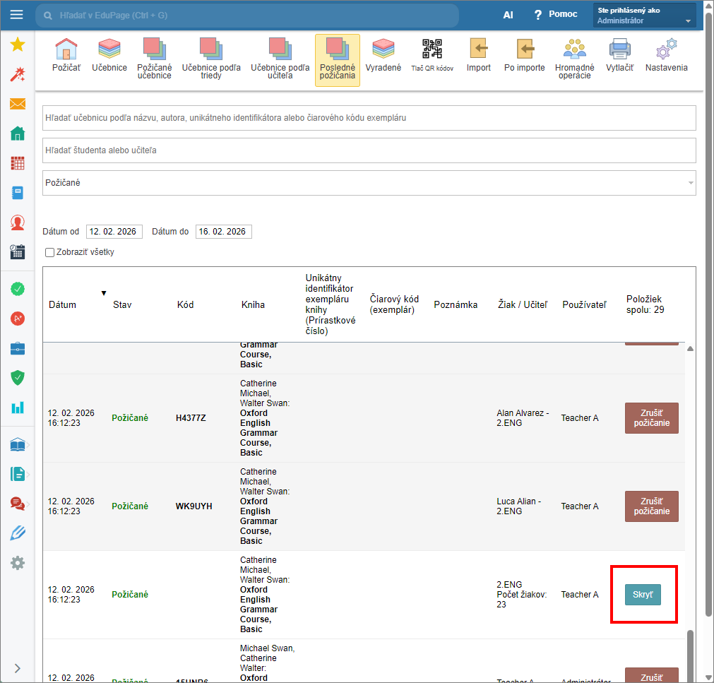 Hromadnú výpožičku prepnete do kompaktného stavu kliknutím “Skryť” na konci zoznamu danej hromadnej výpožičky.