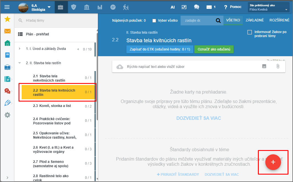 Nastavte sa na tému plánu, ku ktorej chcete vytvoriť domácu úlohu. Stlačte červené +.