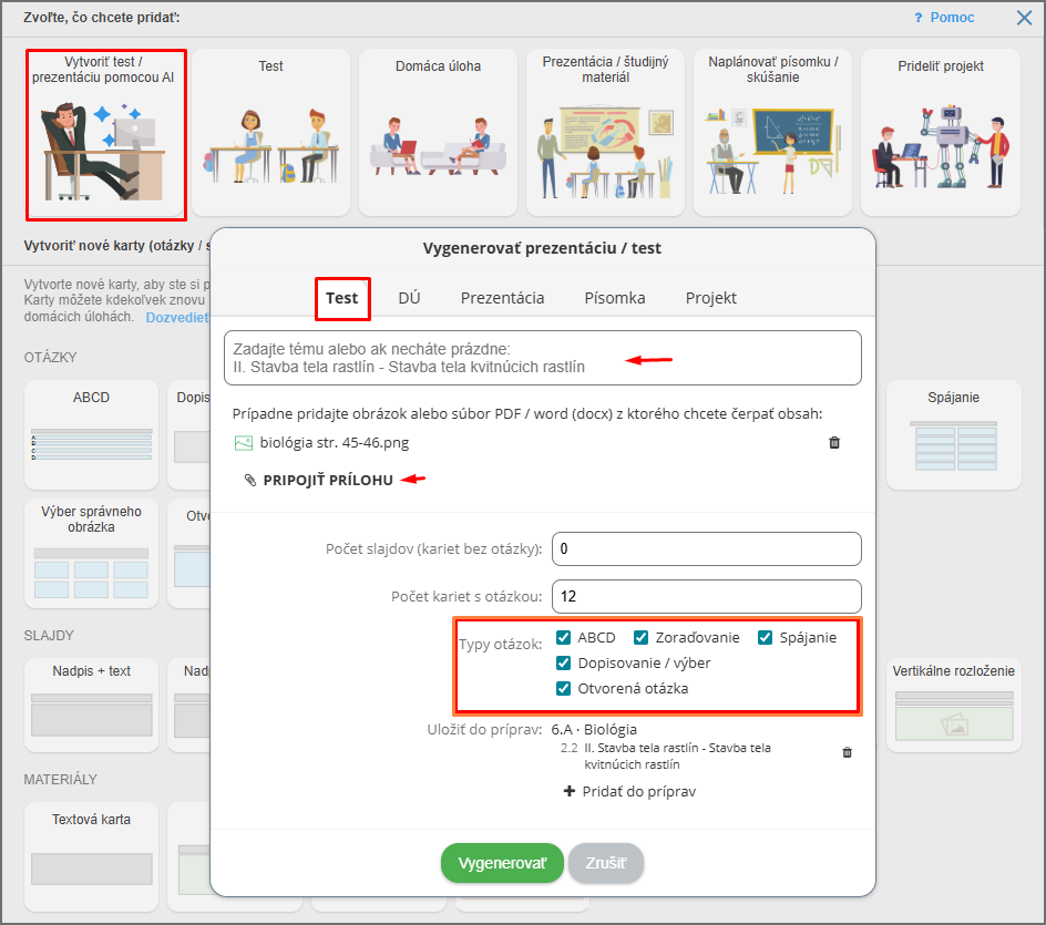 Najskôr sa nastavte na tému plánu, ku ktorej chcete pripraviť test alebo domácu úlohu. Stlačte červené + a vyberte možnosť vytvoriť test pomocou EduPage AI. Do zadania (promptu) stručne popíšte, čo má výsledok obsahovať – okrem témy uveďte aj typy otázok, ktoré chcete použiť.