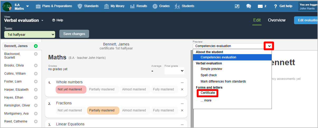 When entering evaluation of standards, you can choose certificate preview.