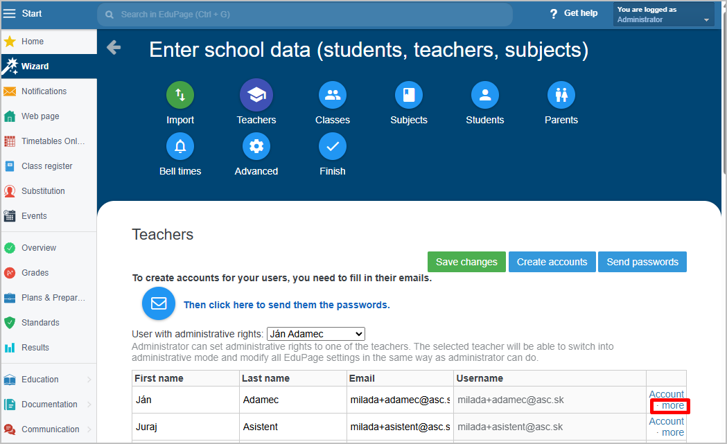 Create an account for the teacher added in this way by clicking the Account link.